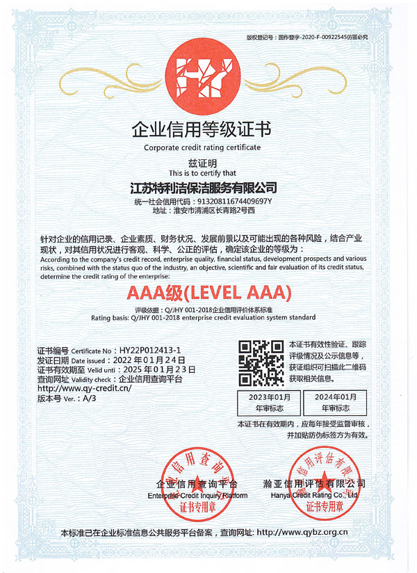 江蘇特利潔保潔服務(wù)有限公司(前稱為淮安市特利潔保潔服務(wù)有限公司),成立于2003年,于2018年經(jīng)工商變更登記為“江蘇特利潔保潔服務(wù)有限公司”,是經(jīng)工商部門登記注冊的合法企業(yè)。公司員工經(jīng)系統(tǒng)培訓(xùn)后上崗,本公司全部采用特利潔專業(yè)清洗設(shè)備、藥劑,并秉承了特利潔先進的管理模式,具備了專業(yè)的清洗技術(shù)、服務(wù)和網(wǎng)絡(luò)優(yōu)勢以及一批訓(xùn)練有素的專業(yè)清潔隊伍及管理人員,致力于推動淮安清洗行業(yè)朝著規(guī)范化、專業(yè)化、標準化方向發(fā)展。公司成立至今,經(jīng)過我們?nèi)w員工的不懈努力,以及本著“誠信、專業(yè)、周到”的服務(wù)使得接受過我們服務(wù)的每一位客戶均能成為我們的長期合作對象。公司也從起初十幾名員工的小公司逐漸發(fā)展壯大,現(xiàn)已初具規(guī)模,并在保潔行業(yè)當(dāng)中占據(jù)一定份額。現(xiàn)與恒大集團等世界500強企業(yè)建立戰(zhàn)略合作。2018年10月公司取得三A信用評級、三A重合同守信用單位...